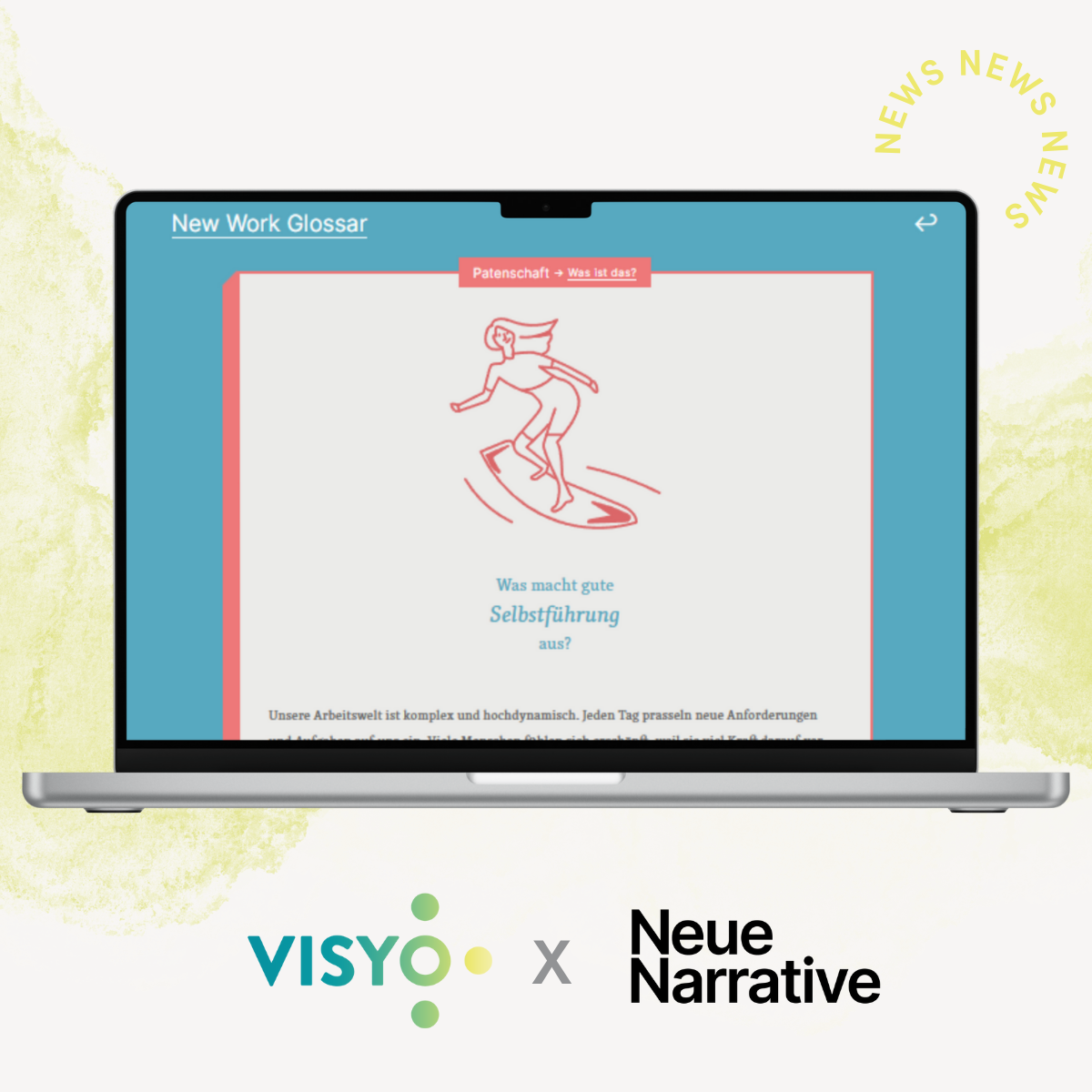 Bei uns gibt es richtig tolle Neuigkeiten: eine Kooperation mit Neue Narrative! Wir haben die Patenschaft für den Begriff Selbstführung im New Work Glossar von Neue Narrative übernommen. Das New Work Glossar erklärt die wichtigsten Begriffe aus der Welt der Neuen Arbeit. Hier geht es zum Artikel: